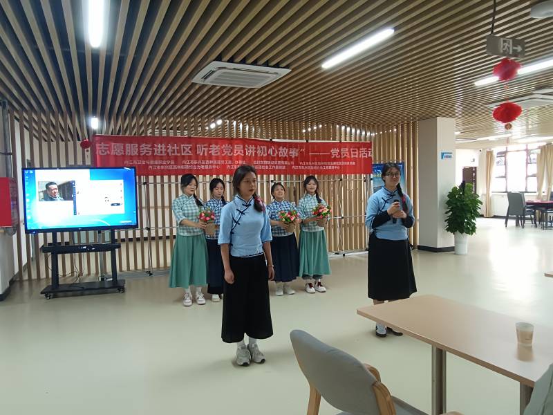 活动现场,药学系入党积极分子表演了歌舞节目《南泥湾》《如愿》,老党员们和大家一起合唱《没有共产党就没有新中国》。在为老服务中心一楼,师生志愿者还运用专业知识为辖区内居民提供义诊、养生药膳讲解等服务,获得居民们的一致好评。