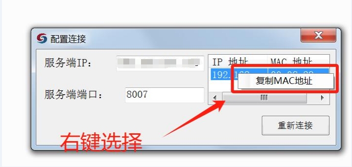 3.客户端工具提供了安装终端的MAC地址获取功能,右键选择连接到服务端的网卡IP,可以复制对应网卡的MAC地址。