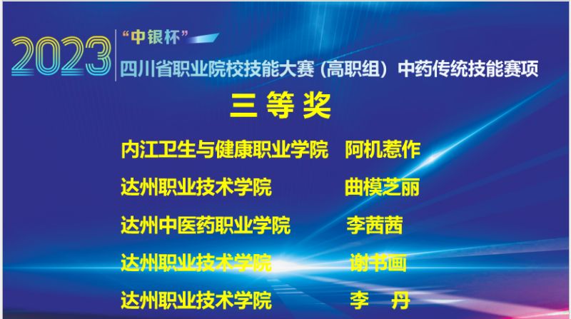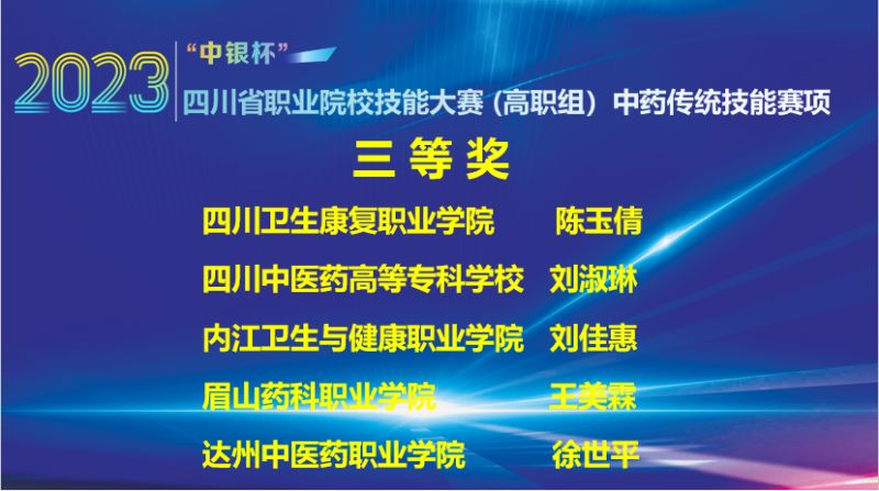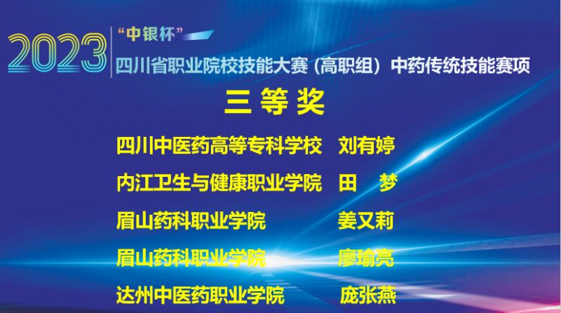 11月24日至25日,2023年职业院校技能大赛(高职组)中药传统技能大赛在雅安职业技术学院成功举办。全省13所院校的49名选手参与,药学系首次组织学生参加了此次比赛。通过两天的激烈角逐,药学系的阿机惹作、刘佳慧、田梦同学荣获三等奖。