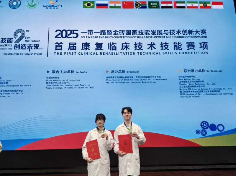 11月9日,2025“一带一路”暨金砖国家技能发展与技术创新大赛首届临床康复技能大赛在山东落幕,学院参赛团队凭借扎实专业功底与稳定发挥,荣获高职组三等奖。