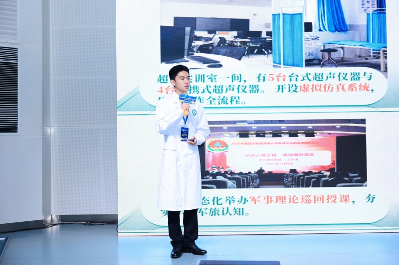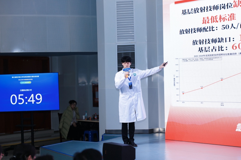 决赛现场,2024级医学影像技术2班学生周宏道以“医影行基层·AI助精准”为主题,结合内江基层医疗需求,规划成为扎根本地、以AI技术赋能的放射技师,清晰勾勒服务基层的职业发展路径;2024级医学影像技术1班学生曾学涛以“医路追光·技向军营”为主题,立志成为部队超声技师,将专业技能与国防需求相结合,彰显当代大学生的家国情怀。答辩环节,两位选手从容应答评审提问,细致阐述学习成果、实践经历与规划细节,良好的专业素养和综合应变能力获得好评。