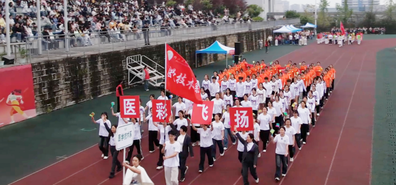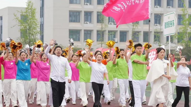 各系学生方队在系部党政班子带领下依次亮相,充分展现专业特色与青春风貌:护理系以标准礼仪姿态,彰显医护人员端庄专业的职业素养;药学系秉持“精诚济世、仁心善治”校训,步伐铿锵、自信昂扬;医学技术系“医彩飞扬”方阵活力满满,展现医技学子的朝气与活力;健康服务系(基础医学部)方队队列整齐,诠释“弘扬国粹,护佑健康”的专业使命。各系方队在操场上开展的精彩才艺展示,赢得现场师生阵阵掌声。