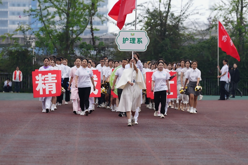 伴随着激昂的《运动员进行曲》,各方阵依次有序入场。国旗队身姿挺拔、步伐坚定,以标准姿态护卫五星红旗入场;校旗队紧随其后,精神抖擞,洁白校旗迎风飘扬;花束队手持缤纷花束,步伐轻盈,为赛场增添春日生机;由男生组成的“卫健之光”彩旗方阵,挥舞五彩旌旗,尽显青年意气。裁判员方队着装整齐、严谨庄重,教职工方队精神饱满、步履沉稳,尽显教育工作者的担当与风采。